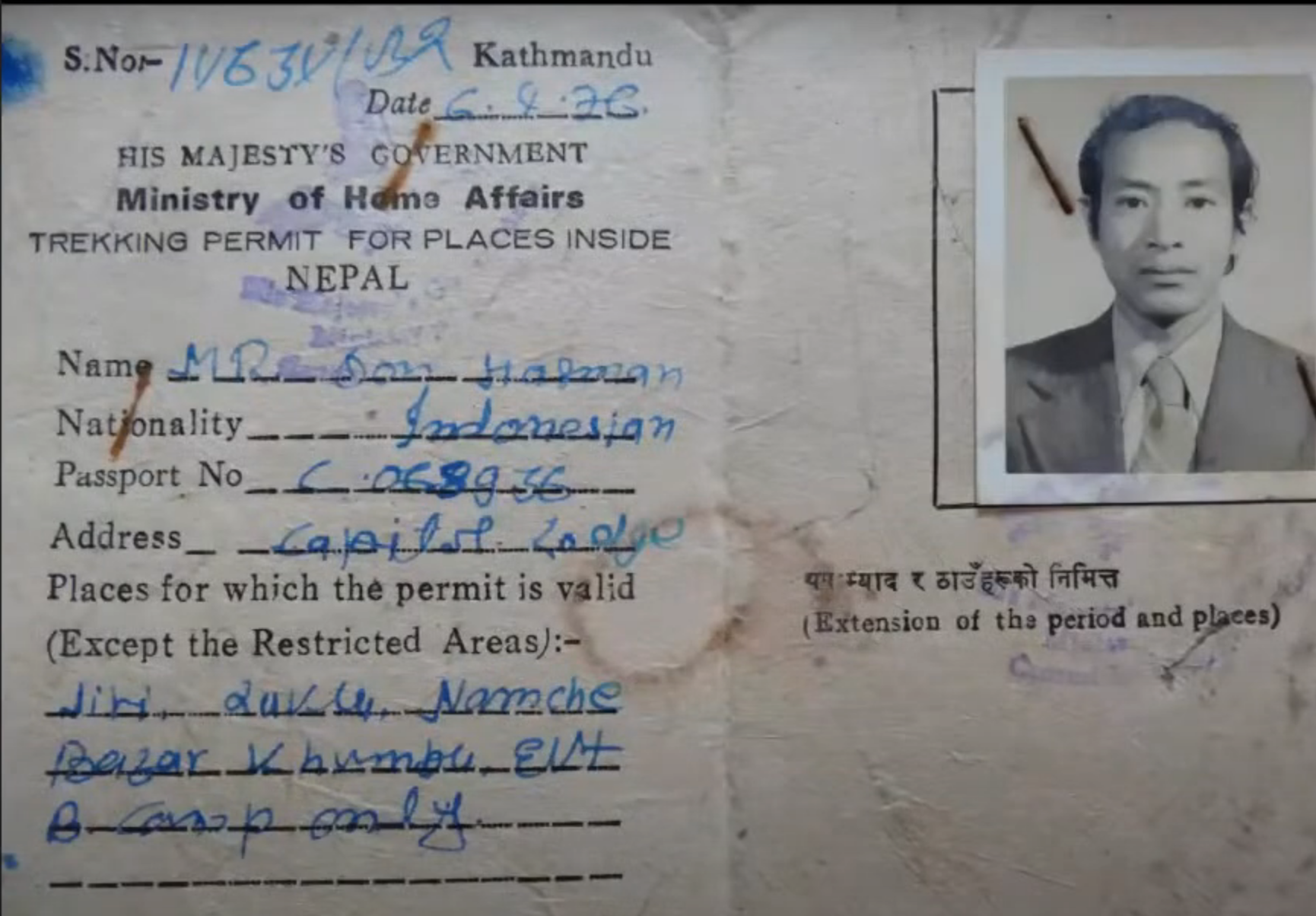 Surat izin masuk ke Nepal yang diberikan kepada Don Hasman pada 1976 dan 1978. (sumber: koleksi pribadi Don Hasman) |