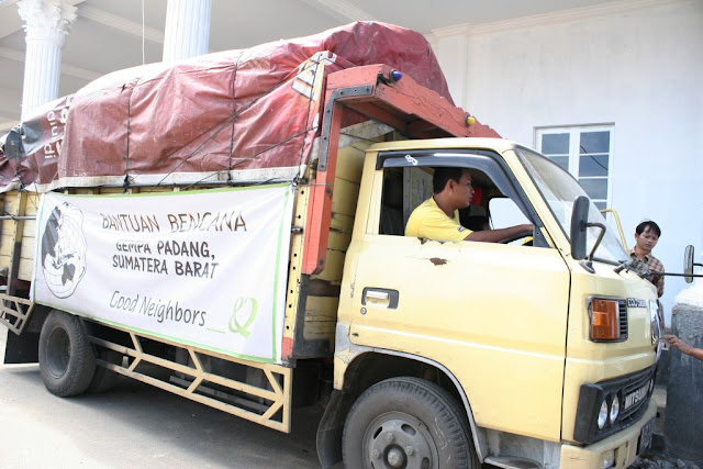 | Truk yang membantu distrubsi bantuan untuk korban gempa Sumatera Barat. Foto : Beritalingkungan.com/Marwan Azis |