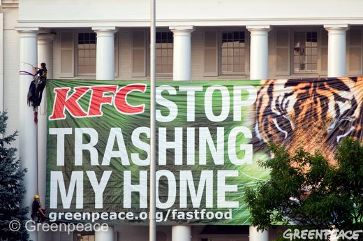 LOUISVILLE, BL- Aktivis Greenpeace hari ini melakukan aksi menggantung banner bergambar Harimau Sumatera pada tiang utama di depan kantor pusat KFC, yang bertuliskan: “KFC Stop Merusak Rumahku.”