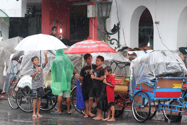 anak-anak yang menawarkan jasa payung ketika hujan menguyur Yogjakarta. Foto: dok radarjogja |