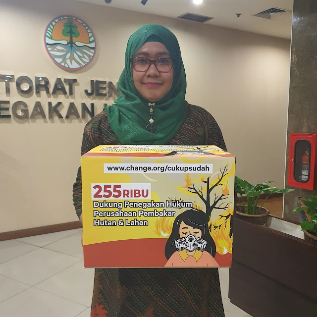 Tujuannya untuk beraudiensi dan menyerahkan 255 ribu dukungan warganet yang digalang melalui laman petisi Change.org. Petisi tersebut adalah bentuk dukungan pada KLHK untuk menghukum perusahaan pembakar hutan dan lahan, yang langsung diterima oleh Rasio Ridho Sani selaku Direktur Jenderal Penegakan Hukum, Yazid Nurhuda selaku Direktur Penegakan Hukum Pidana, dan Sugeng Priyanto selaku Direktur Pengawasan dan Penerapan Sanksi Administratif.