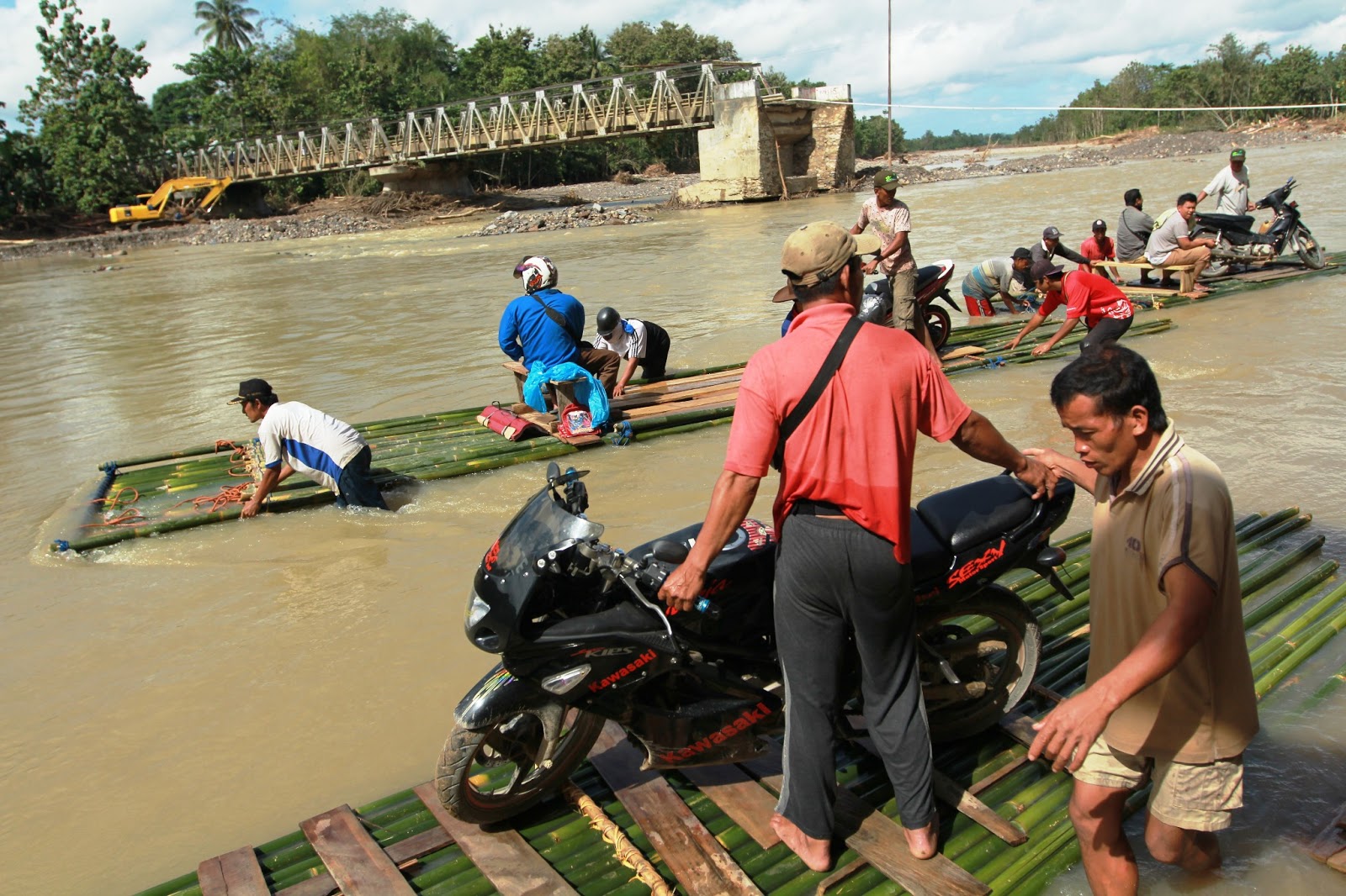 Nah, bagi warga sekitar dan pengguna roda dua takl ada pilihan lain selain naik rakit. Sedikitnya terdapat sepuluh buah rakit berukuran empat kali dua meter yang siap melewati arus sungai yang deras. Rakit-rakit ini digilir satu persatu mengangkut penumpang.