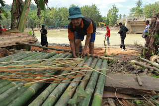 Ya, Sepekan belakangan hidup sebagian warga Konawe Selatan seolah kembali ke jaman bahuela. Rakit bambu tiba-tiba kembali populer sebagai moda transportasi dan kini begitu aktrab bagi warga di wilayah itu. Betapa tidak akses jalan darat yang selama ini menghubungkan kawasan laut Torobulu ini sama sekali tak bisa lagi dilewati kendaraan roda empat. Terputus tepat di Kelurahan Ambalodangge akibat yang melanda Konawe Selatan beberapa pekan lalu.