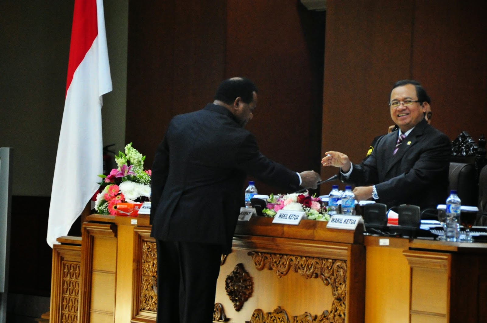 Menteri Lingkungan Hidup Balthasar Kambuaya menyalami Wakil Ketua DPR RI, Priyo Budi Satoso saat rapat Paripurna DPR, Selasa (16/9) yang membahas dan mengesahkan UU Pencemaran Lintas Batas.