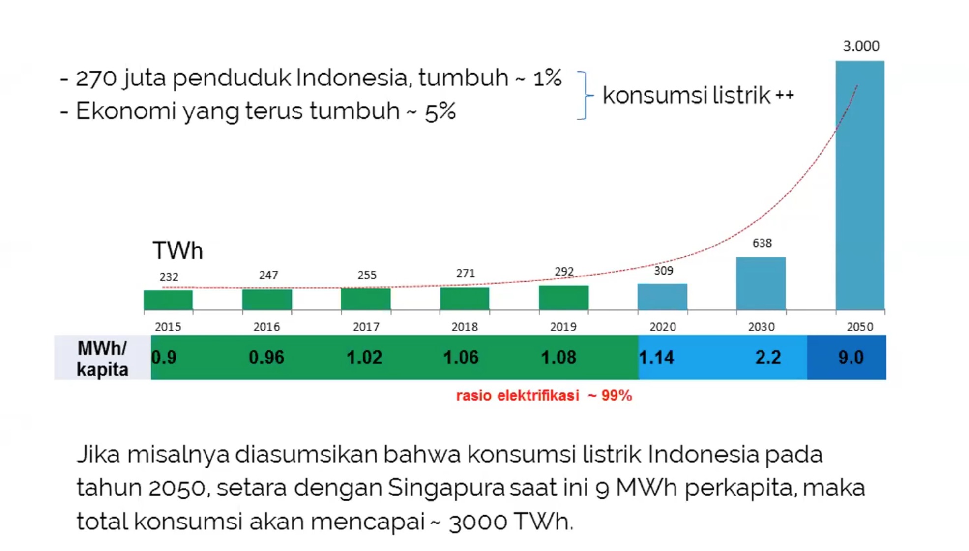 | Kebutuhan listrik 3000 TWh, dibutuhkan PLTS berkapasitas 1800 GWp (sumber: David F. Silalahi) |