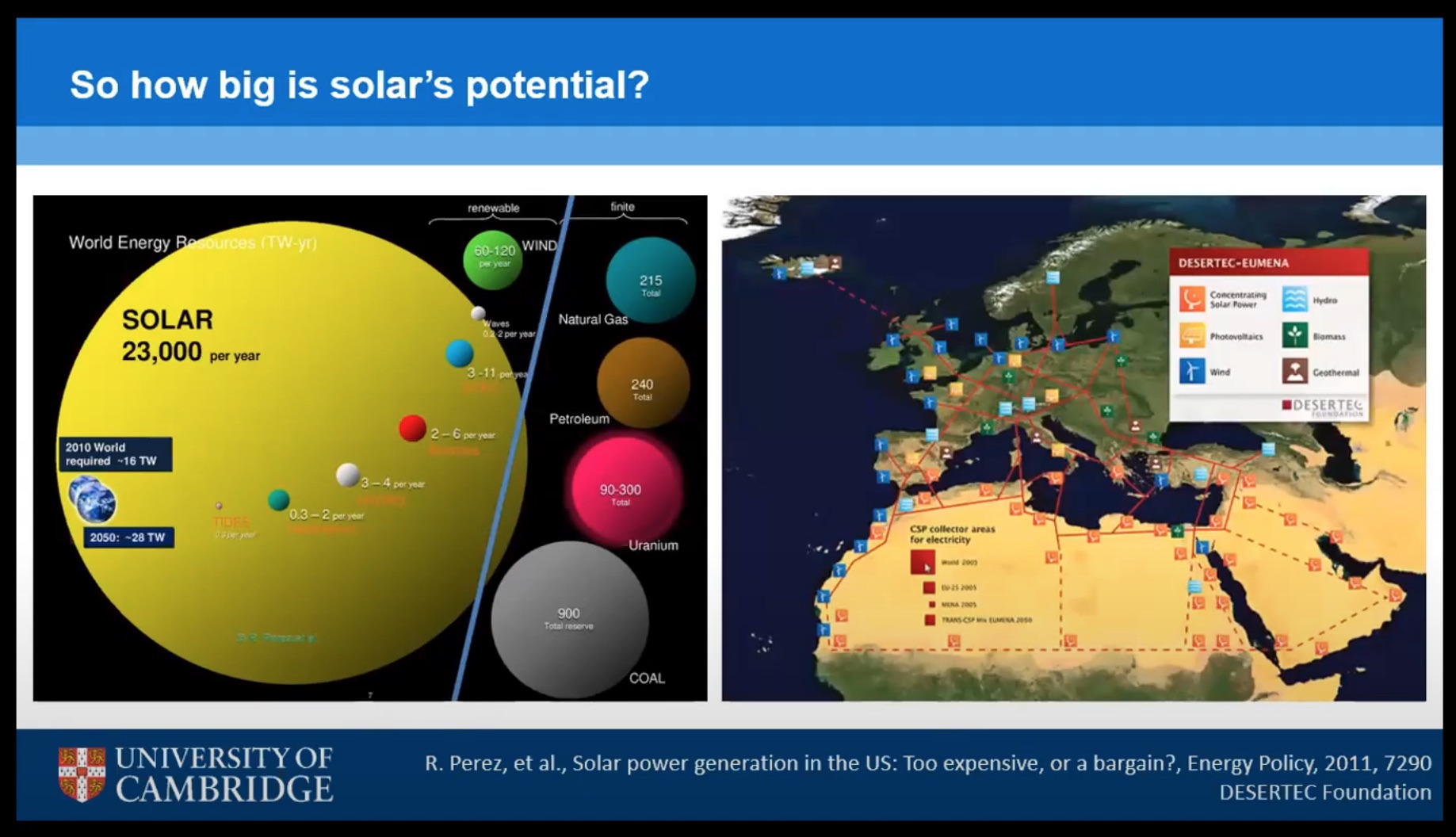 “Jika buat power plan menggunakan panel surya, kita hanya perlu menutup area seluas tertentu untuk mencukupi kebutuhan energi seluruh dunia. Tentu saja perlu mempertimbangkan transmisi dan distribusi,” terangnya.