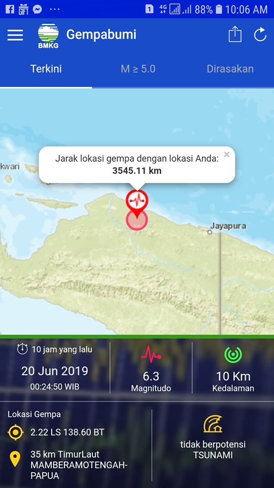 Berdasarkan info Badan Meteorologi, Klimatologi, dan Geofisika (BMKG) melalui situs resminya, gempa terjadi pukul 00.24 WIB, Kamis (20/6/2019) pada 2,22 LS dan 138,60 BT.