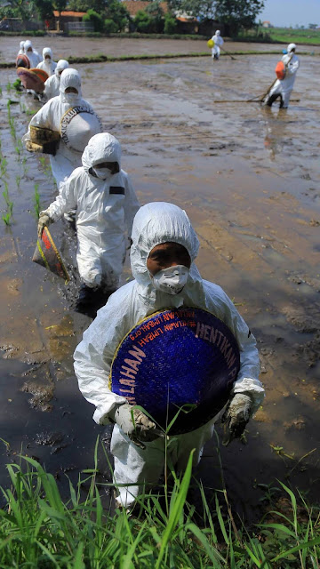 Aksi para aktivis lingkungan yang menentang pembuangan limbah ke Sungai Citarum, yang juga mencemari areal persawahan sekitarnya. Foto : Sindo. |