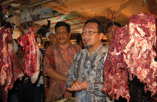 Menteri Pertanian RI, Suswono berdialog dengan pedagang daging di Pasar Cinde Palembang. Foto : Prioritasnews