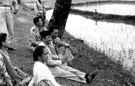 | Bung Karno dan rombongan melepas lelah sambil memandang persawahan saat berkunjung ke Parepare, Sulawesi Selatan, pada tahun 1958. Foto : Fans Page Ir Soekarno. |