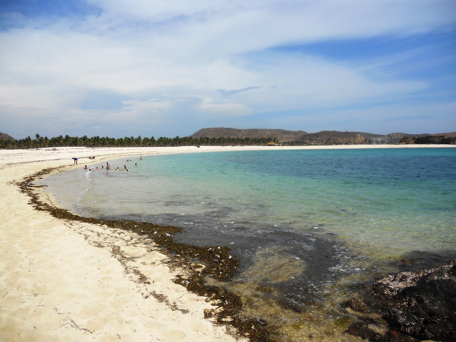 Pantai ini di kelilingi pasir putih dengan keindahan bukit di sekitarnya. Air laut yang tenang cocok untuk traveller yang suka berenang.