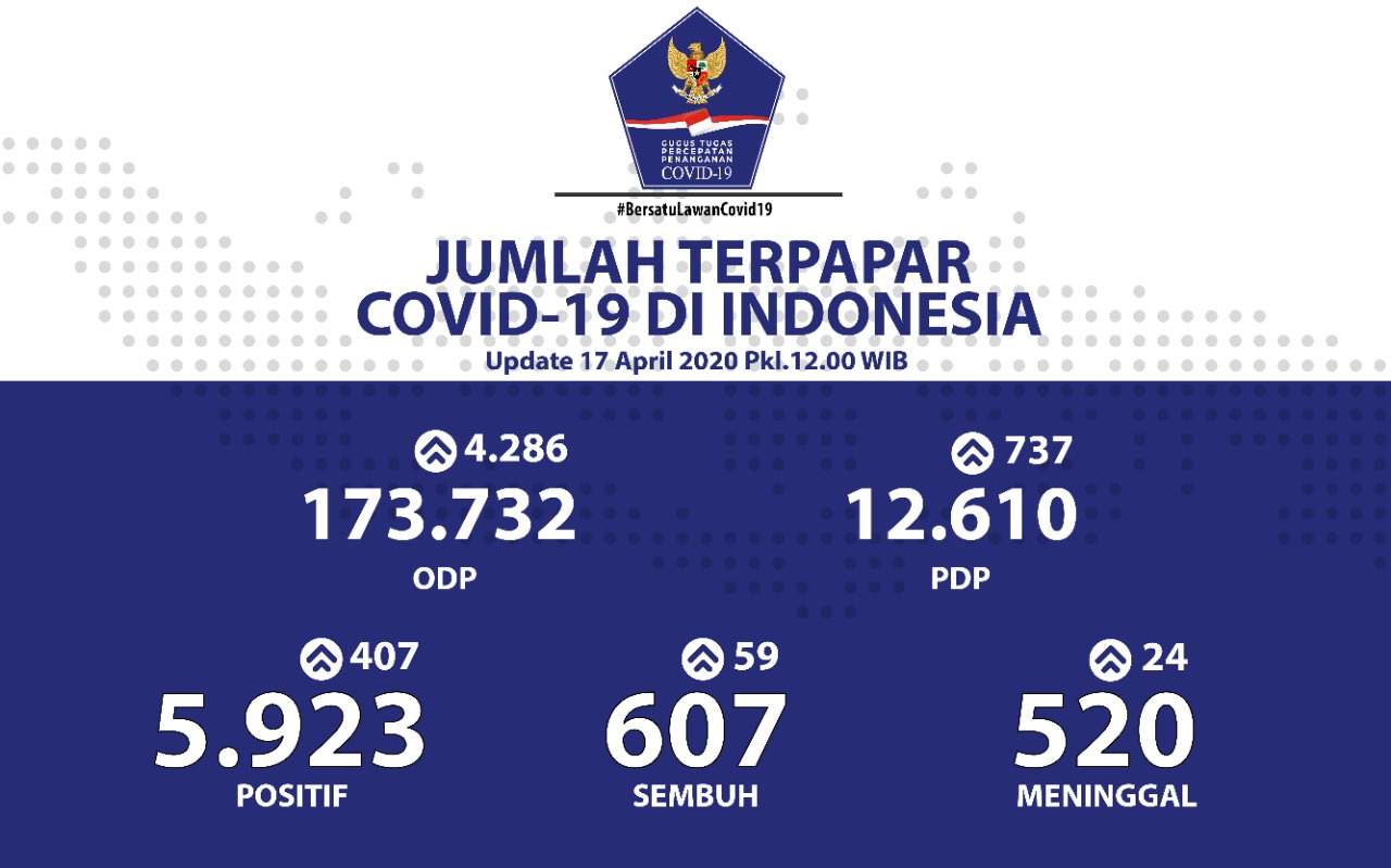 Kemudian untuk jumlah orang dalam pemantauan (ODP) terdapat penambahan sebanyak 4.286 hingga total menjadi 173.732 orang dan pasien dalam pengawasan (PDP) bertambah 737 dengan total menjadi 12.610 orang. Data tersebut diambil dari 34 provinsi di Tanah Air.