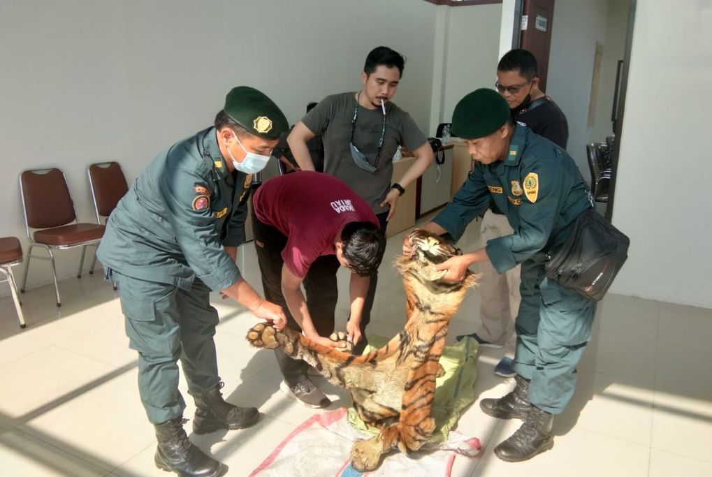Tim mengamankan 1 kulit harimau sumatera lengkap dan 2 ekor janin rusa, plus 2 sepeda motor dan alat jerat. BAT dan barang bukti dibawa ke Kantor Seksi Wilayah II Balai Gakkum KLHK Wilayah Sumatera. (Jekson Simanjuntak)