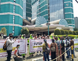 MEDAN, BERITALINGKUNGAN.COM – Aliansi Gerak Tutup TPL bersama perwakilan masyarakat adat dari seputaran Danau Toba menggelar aksi di depan kantor PT. TPL, Gedung Uniplaza jalan Letjend. Haryono MT No.A-1, Rabu, 28/7/2021. Mereka menuntut penutupan PT. Toba Pulp Lestari (TPL) karena telah menyengsarakan rakyat dan merusak lingkungan hidup.