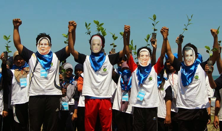 Uniknya, dalam kegiatan tersebut mereka mempertanyakan komitmen pasangan capres-cawapres dalam program penyelamatan lingkungan hidup, menanam pohon dengan memakai topeng wajah kedua calon pasangan calon presiden.