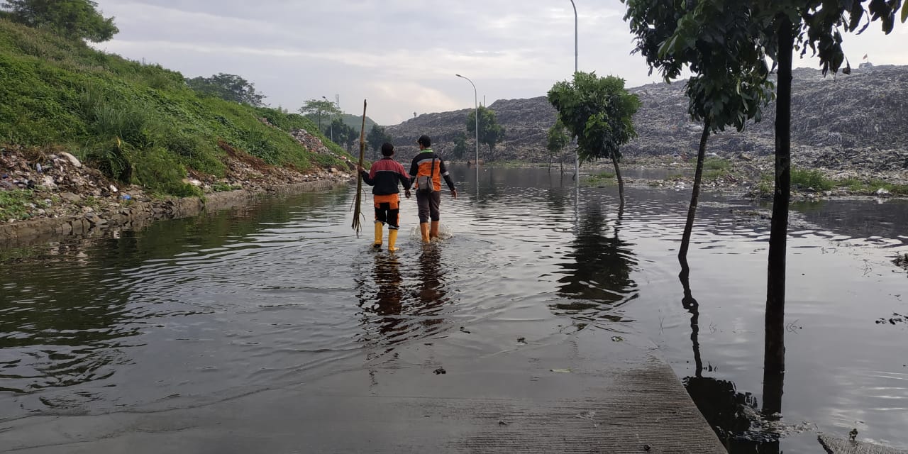 Material sampah bercampur leachate menutup lahan kosong, kali Ciketing, jalan operasional TPST Bantargebang akibatnya 3 unit truk sampah terguling. Juga menyebabkan ratusan meter pagar arkon terendam lindi.