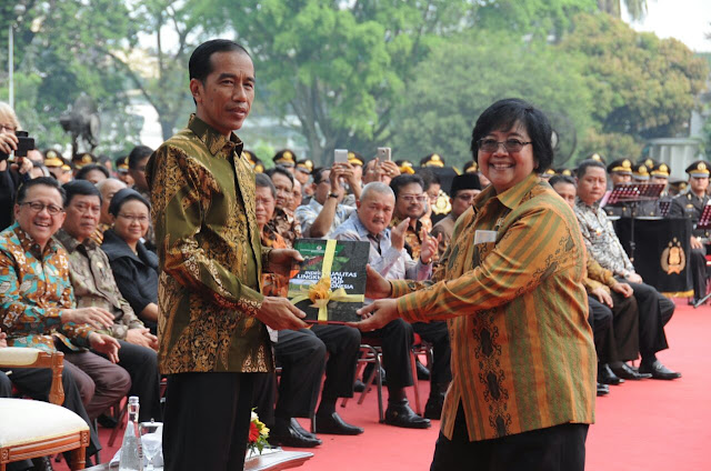 BOGOR, BL- Menteri Lingkungan Hidup dan Kehutanan, Dr. Ir. Siti Nurbaya, MSc menyerahkan buku Indeks Kualitas Lingkungan Hidup (IKLH) 2014 dan Indeks Tata Kelola Kehutanan 2014 kepada Presiden Joko Widodo kemarin di Istana Bogor, bertepatan dengan puncak peringatan Hari Lingkungan Hidup Sedunia 2015.