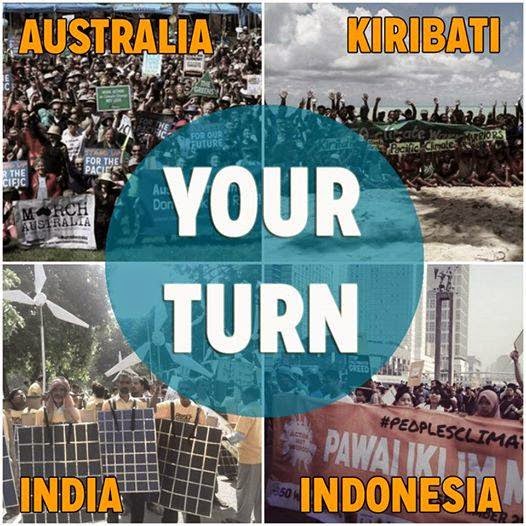 Aksi aktivis lingkungan yang tergabung dalam #PeopleClimate di berbagai belahan dunia seperti di Australia, Kiribati, India dan Indonesia. |