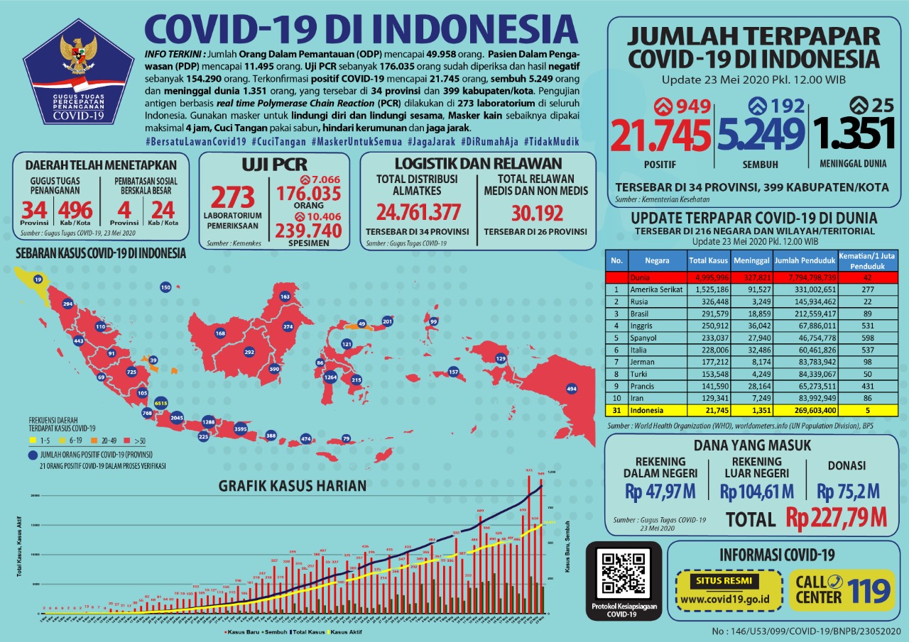 “Konfirmasi COVID-19 yang positif naik sebanyak 949 orang, sehingga totalnya menadi 21.745 orang, sembuh meningkat 192 orang, sehingga menjadi 5.249 orang, meninggal 25 orang, sehingga menjadi 1.351 orang,” ungkap Juru Bicara Pemerintah untuk COVID-19 Achmad Yurianto dalam keterangan resmi di Media Center Gugus Tugas Percepatan Penanganan COVID-19, Graha Badan Nasional Penanggulangan Bencana (BNPB), Jakarta, Sabtu (23/5).
