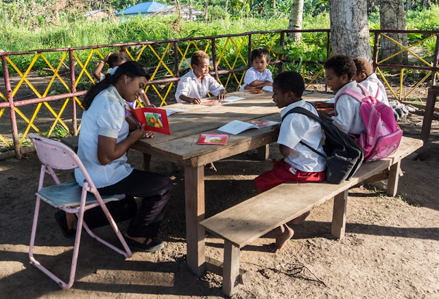“Kami menggunakan Buku Paket Kontekstual Papua (BPKP) untuk mengajar anak-anak kelas awal. Untuk anak-anak yang lamban membaca kami gunakan Buku Bacaan Berjenjang (B3),” ungkap Satriani guru kelas 1. “Kedua paket buku ini terbukti membantu anak-anak cepat paham membaca dan berhitung,” sambungnya. BPKP adalah paket buku untuk anak kelas I-III yang ditulis dengan bahasa Indonesia dialek Papua. Ilustrasi dan contoh-contoh yang ada di buku ini dipilih dari hal-hal yang ada di Papua dan dimengerti oleh anak-anak Papua. Sedangkan B3 adalah paket buku bacaan untuk membantu anak-anak belajar membaca. B3 terdiri atas 6 level. Level A adalah buku untuk anak-anak yang baru pertama belajar membaca. Setiap halaman terdiri atas gambar dan satu kata saja. Sedangkan level B, C, D dan F isinya semakin meningkat. Anak-anak kelas awal, kelas I, II dan III dikelompokkan berdasarkan kemampuan membacanya. Mereka diajar secara bersama-sama dengan buku yang sesuai dengan kemampuan membacanya.