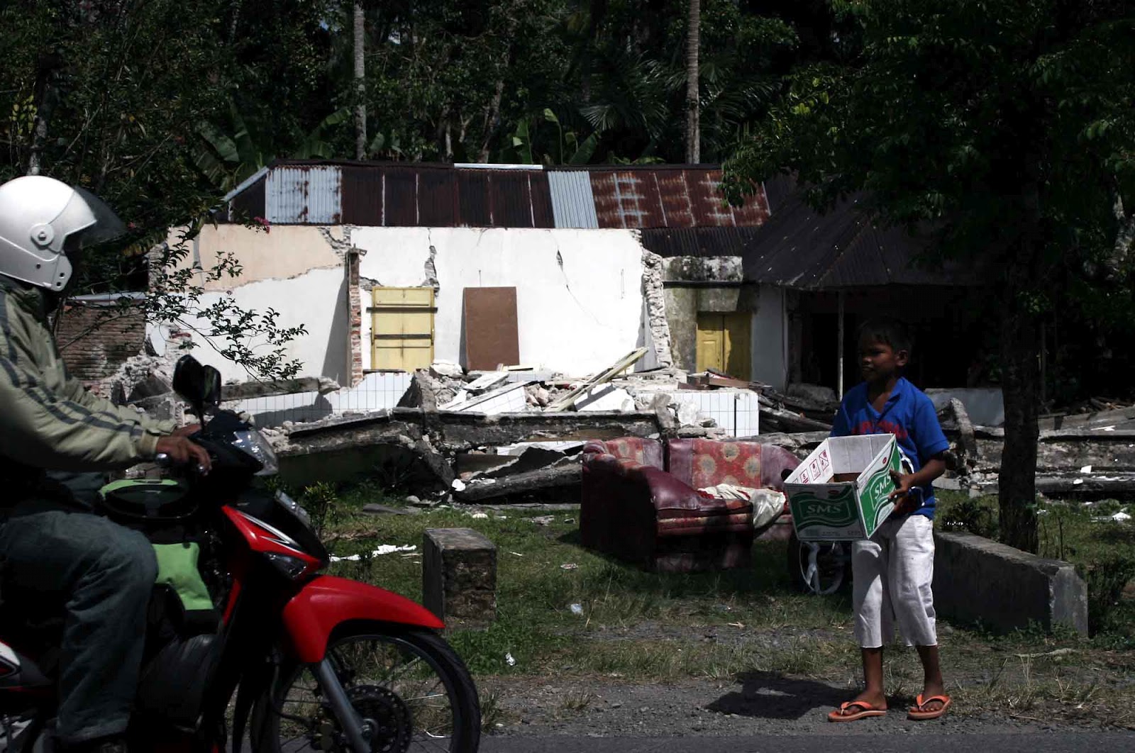 | Anak-anak korban di Pariaman minta sumbangan kepada para pengguna jalan. Foto : Beritalingkungan.com/Marwan Azis. |