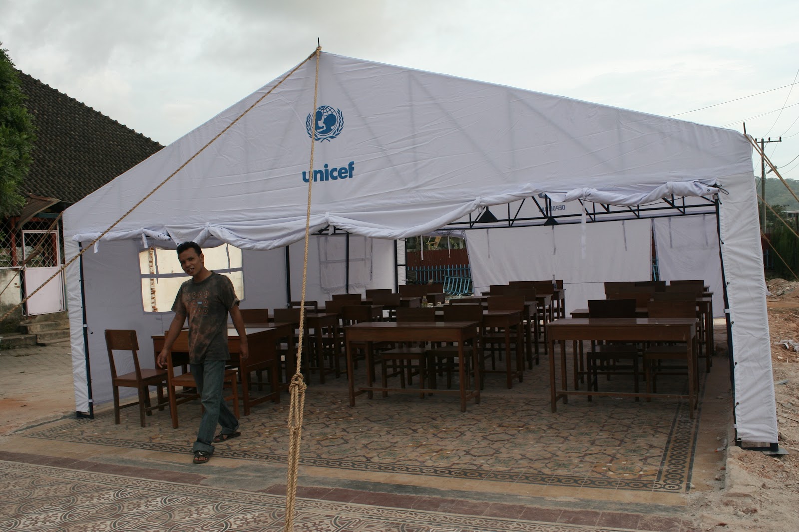 | Sekolah darurat dibangun UNICEF-Depdiknas. Foto : Marwan Azis. |