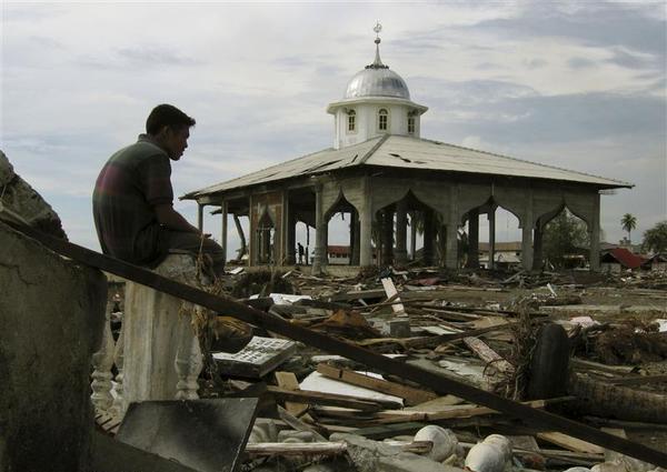 Seorang pria memandang ke arah reruntuhan Masjid akibat gelombang tsunami di Meulaboh, Aceh #Subhanallah.