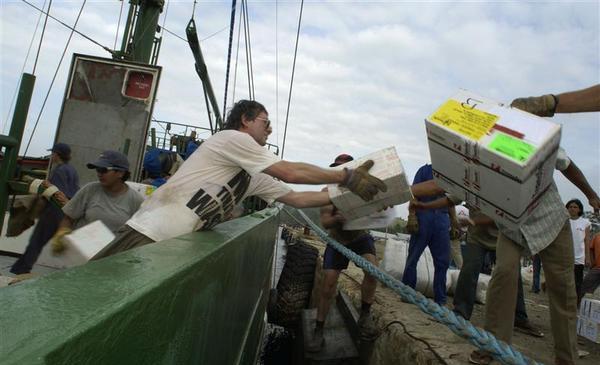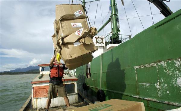 Bantuan kemanusian dan kesehatan yang diorganisir oleh Medecins Sans Frontiers (Dokter Tanpa Batas) sedang dimuat kedalam Kapal Greenpeace Rainbow Warrior II, di Krueng Raya, Sumatra, Indonesia. Pengiriman bantuan kemanusian dan kesehatan ini ditujukan ke daerah Meulaboh di pantai barat Aceh.