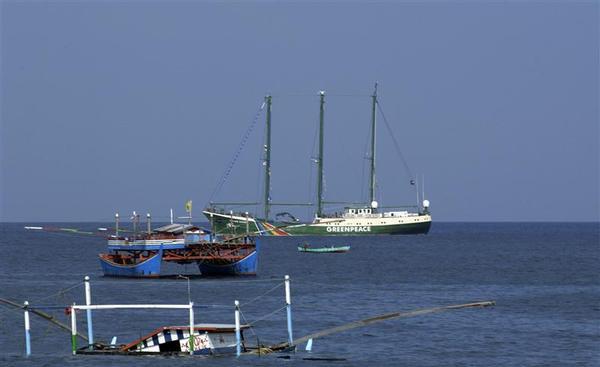 Kapal Greenpeace Rainbow Warrior berlabuh di batas pantai dengan latar depan sebuah kapal yang tenggelam akibat gelombang tsunami di Aceh. Bersama Medecins Sans Frontiers (Dokter Tanpa Batas) Rainbow Warior II membantu mendistribusikan bantuan kepada korban melalui jalur laut, hal ini sangat krusial mengingat akses jalan di darat tidak bisa dilalui.
