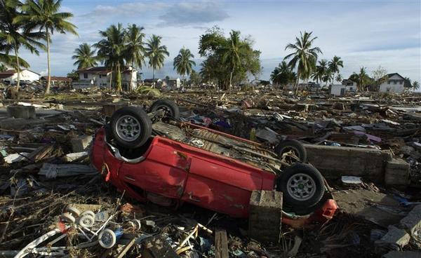 Mobil yang hancur dan dorongan bayi terlihat di antara reruntuhan rumah yang disebabkan tsunami besar di Meulaboh, Aceh.